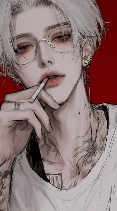 Midjourney Bot 更新时间:2026-01-08 00:00动漫风格写实风格,2D,BJD,18岁男孩,冷白皮,灰色头发,白色长袖T恤,纹身,手指夹香烟、银色半框眼镜、背景红色、上半身,正脸正身,看向镜头仰视镜头时眼神略显深邃,88k高清 --ar 71:128 --style raw --stylize 800 --niji 6 --profile 2twrvmr