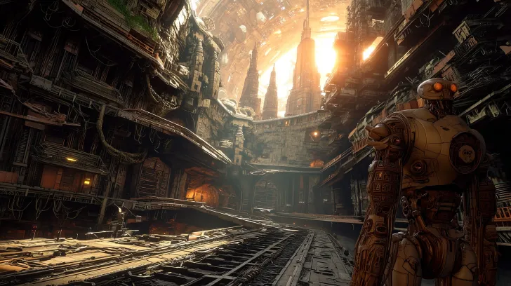 Midjourney Bot 更新时间:2026-01-08 00:03俯视大广角视角的蒸汽朋克场景,钢铁都市笼罩在橙黄的光辉之中,巨大的平台上布满了四通八达的纵横轨道,巨型反射镜和透镜构造的建筑与蒸汽工厂构成密集建筑群,高大的机器人穿行其间且比建筑更加庞大,受H.R. Giger工业美学启发,融合Syd Mead的美术风格,OC渲染器渲染,高分辨率图像,超精细细节,最佳质量,超高清画面。 超写实, --ar 16:9 --v 7 --stylize 100 --sref https://images.gogpt.vip/aigf/origin/20251210/1765295246454432_4.png https://images.gogpt.vip/aigf/origin/20251210/1765295246454432_3.png --oref https://images.gogpt.vip/aigf/origin/20260107/1767800483189422_2.png --ow 400
