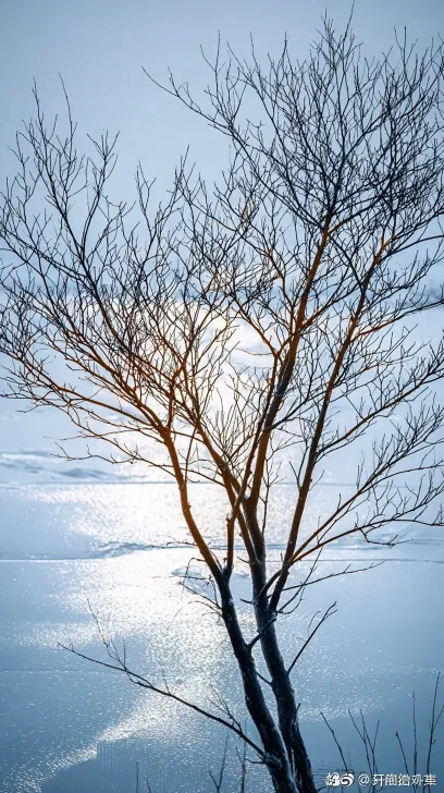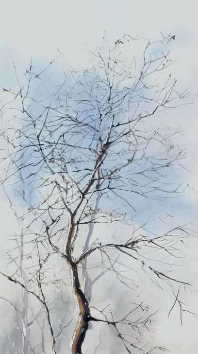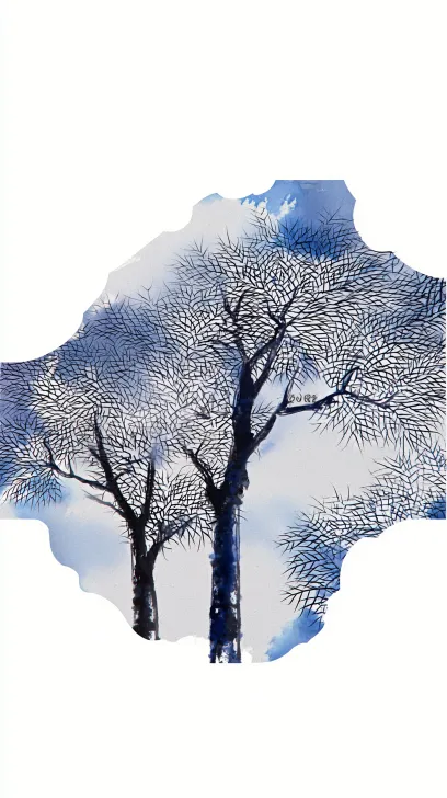 Midjourney Bot 更新时间:2026-01-06 00:10https://images.gogpt.vip/aigf/m_origin/20260106/2013883/lq7es97iyhf8w7xa.jpg 参考图中两棵相依的无叶枯树,树干纤细且呈深黑褐色,枝桠细密如丝,枝桠细密交错呈网状散开,枝干线条纤细且富有层次感,无任何叶片或果实,树干为深黑褐色形成冷暖对比,色彩饱和度低且偏冷调,整体呈现出冰蓝系的清冷质感,写意水彩与摄影结合的艺术风格,弱化树干纹理,强化线条的疏密与形态,树干线条锐利,画面边缘有不规则的水彩晕边效果,弱化写实细节,强化意境表达。场景为无实景环境元素,氛围营造出清冷、静谧、空灵的冬日意境,兼具孤寂的美感与冰雪的纯净感。背景要png格式 --ar 9:16 --v 7 --stylize 15 --iw 1.75 --no 不出现文字和logo
