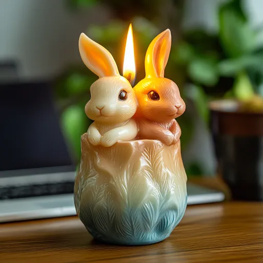 Midjourney Bot 更新时间:2026-01-06 00:04一款精美的蜡烛,蜡烛造型是两只兔子,其中一只兔子骑在另一只兔子的脖子上,兔子呆萌可爱,蜡烛色彩鲜艳,蜡烛从顶部散发出温暖的火焰。增添了生动的细节。背景中有一本笔记本,桌面呈现出自然的木纹质感,旁边还有一台笔记本电脑和一盆绿色植物,营造出温馨宁静的氛围。 --ar 1:1 --v 6.1 --stylize 107