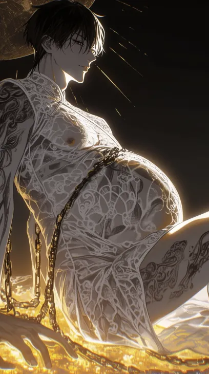 Midjourney Bot 更新时间:2026-01-06 00:06一个俊美动漫男人,怀孕,清晰8K,冷白皮,,腹肌可见,双腿细长,发光,夜晚,身上胸前和腿上都有纹身,白色蕾丝多个链条旗袍oversized,黄白线画,后仰,呈大字型坐在地上,正面视角视觉系帅哥,黑白线画,日韩漫画,暖色调。清晰8K。黑色直发,黑眼睛,冷漠的眼睛,冷白皮,嘴唇浅色,帅气的男人, --ar 9:16 --style raw --stylize 180 --niji 6 --no no