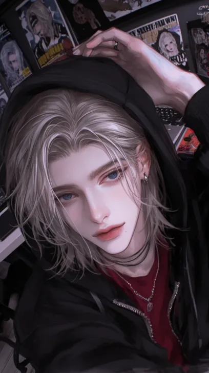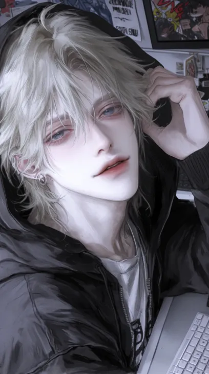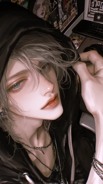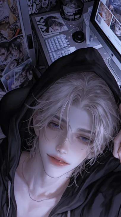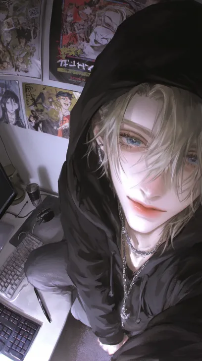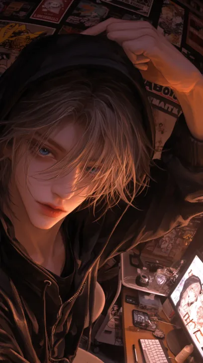Midjourney Bot 更新时间:2026-01-05 00:12冷色,精致的细节,俯拍视角,从上到下拍摄,一个浅黄色短发(凌乱)的成年男性,有着深海蓝色的眼睛,穿着黑色连帽卫衣,一只手拉着卫衣帽子边缘,坐在椅子上,看镜头,嘴角带着坏笑(戏谑的笑),背景是昏暗的房间,冷色调,有凌乱的漫画海报墙,书桌上有键盘和电脑,超高清画质,清透感,柔和的光影,细节的发丝,二次元动漫画风,32k画质处理 --ar 9:16 --stylize 250 --niji 6 --profile zcybdkq z48wqmy wa92ist enrcvog --no 怼脸拍,侧脸,伸手