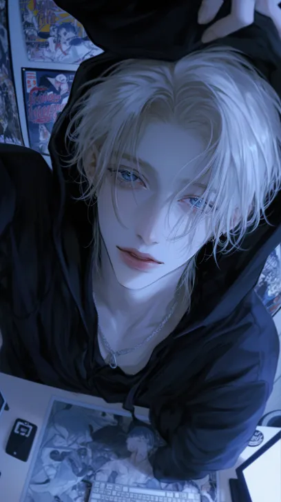 Midjourney Bot 更新时间:2026-01-05 00:08鱼眼镜头,俯拍构图,冷色调(蓝色调)精致的细节,俯拍视角,从上到下拍摄,一个浅黄色短发(凌乱)的成年男性,有着深海蓝色的眼睛,穿着黑色连帽卫衣,一只手拉着卫衣帽子,坐在椅子上,看镜头,嘴角带着坏笑(戏谑的笑),背景是昏暗的房间,冷色调,有凌乱的漫画海报墙,书桌上有键盘和电脑,超高清画质,清透感,柔和的光影,细节的发丝,二次元动漫画风,32k画质处理 --ar 9:16 --stylize 250 --niji 6 --profile 34cb6jv zcybdkq wa92ist mtigg2v --no 怼脸拍,侧脸,伸手