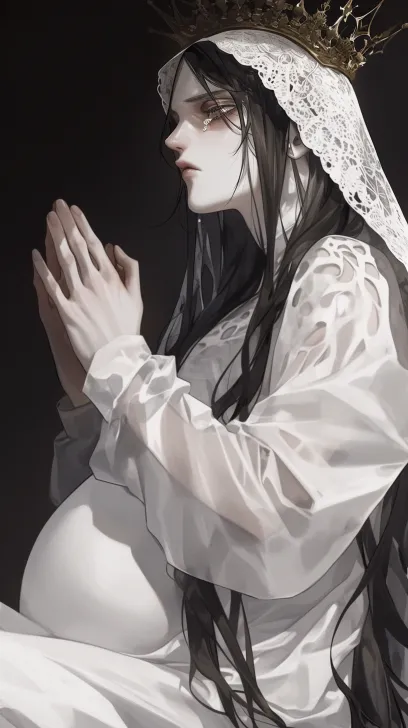 Midjourney Bot 更新时间:2026-01-05 00:11一个俊美动漫美学pregnant 青年男人,黑色长发,长发柔 顺,他双手合十祈祷,他穿着白色连衣裙和王冠,连帽王冠带有镂空蕾丝,坐在,黑色背景,明暗对照,眼睛悲伤而破碎,tears makeup,深色背景,光影细节,高画质 --ar 9:16 --style raw --stylize 180 --niji 6 --no no