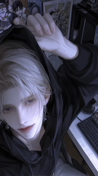 Midjourney Bot 更新时间:2026-01-05 00:15冷色,精致的细节,俯拍视角,从上到下拍摄,一个浅黄色短发(凌乱)的成年男性,有着深海蓝色的眼睛,穿着黑色连帽卫衣,一只手拉着卫衣帽子边缘,坐在椅子上,看镜头,嘴角带着坏笑(戏谑的笑),背景是昏暗的房间,冷色调,有凌乱的漫画海报墙,书桌上有键盘和电脑,超高清画质,清透感,柔和的光影,细节的发丝,二次元动漫画风,32k画质处理 --ar 9:16 --stylize 250 --niji 6 --profile zcybdkq z48wqmy wa92ist enrcvog em9bgqz --no 怼脸拍,侧脸,伸手