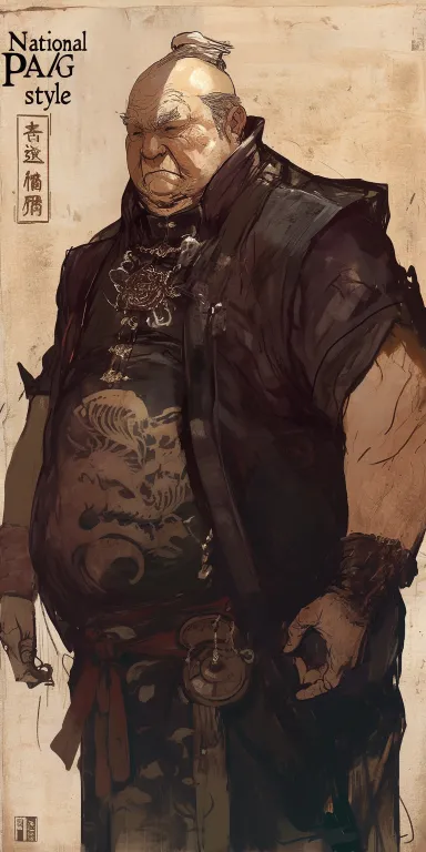 Midjourney Bot 更新时间:2026-01-05 00:21胖子爷爷,亚洲,极具压迫感的视角。圆脸双下巴,宽大的下颚骨,样貌粗犷,粗壮的脖子和斜方肌,正方形的大胸肌,发达的肱二头肌,粗壮的手腕,上半身。国风 --ar 1:2 --stylize 100 --niji 6 --no nudity