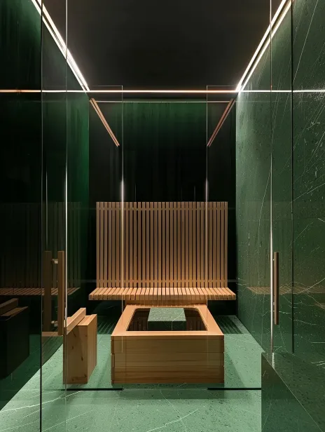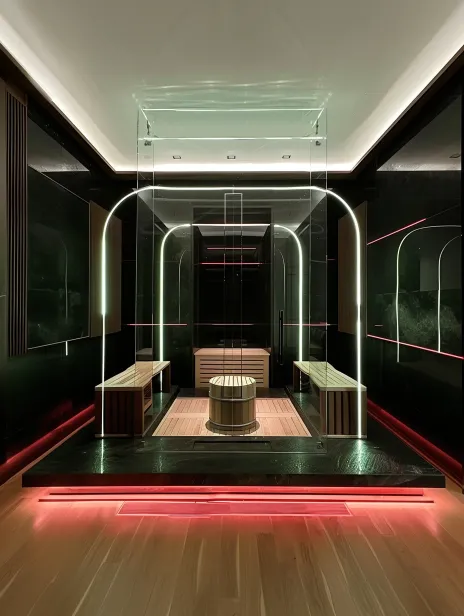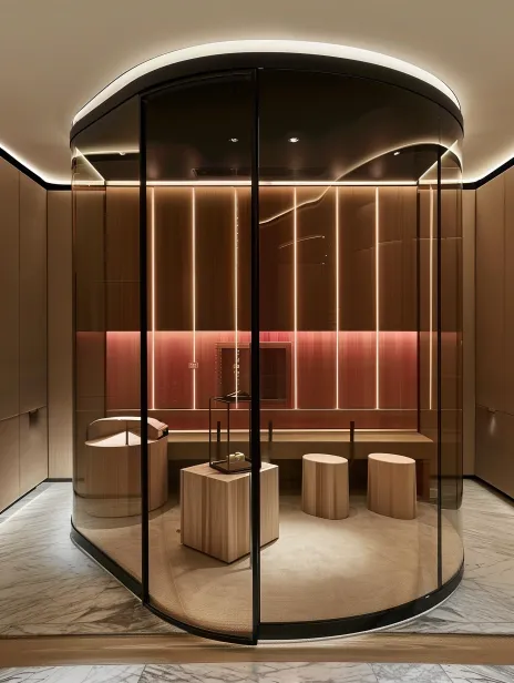 Midjourney Bot 更新时间:2026-01-02 00:15在家居场景,一个小型桑拿房,咖啡色,弧角玻璃,内部实木板条垂直,雪松实木板,发光背板,黑色玻璃,实木不规则凳子,粉色照明设计,实木平台,艺术设计元素的外观,无曝光,真实摄影效果,佳能相机,前视图,超广角,8K,32K,超高分辨率 --ar 3:4 --v 6.0 --style raw --stylize 100 --sref https://images.gogpt.vip/aigf/m_origin/20260102/1250194/dftpn0opxgdsr0zb.jpeg https://images.gogpt.vip/aigf/m_origin/20260102/1250194/u958bi3rybtfpcm0.jpeg
