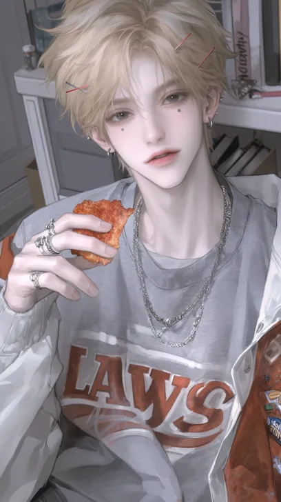Midjourney Bot 更新时间:2026-01-02 00:16少年感,眼神挑衅,黄色长发,黑色眼睛,灰色涂鸦卫衣,红白色棒球服,发卡装饰,耳钉,叠戴项链,戒指,拿着红色乐事薯片。细腻厚涂,帅哥,房间,朋克,背景丰富,俯视视角,远景广角 --ar 9:16 --style raw --stylize 800 --niji 6 --sref https://images.gogpt.vip/aigf/origin/20251230/1767110218232668_3.png https://images.gogpt.vip/aigf/origin/20251229/1766986013538251_2.png --sw 191 --profile m212hx7 j73crg6 --no 纹身,女生,女性,娃娃脸,鼻钉,长发,妖艳,挑染,美丽,阴暗,鼻钉,仰头,水,眼泪,汗水,眼镜