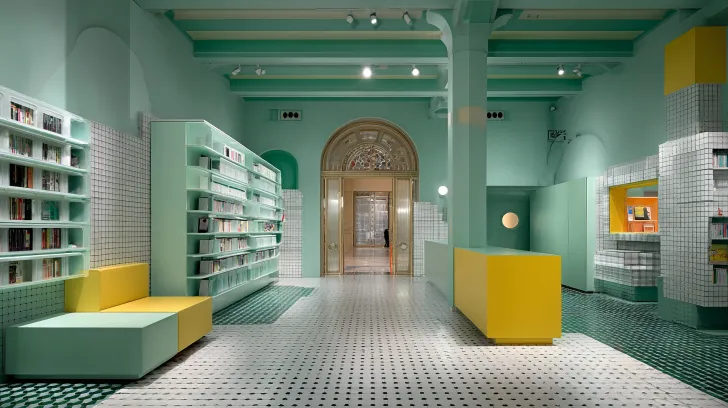 Midjourney Bot 更新时间:2026-01-02 00:16图书馆,复古未来风格,孟菲斯美学。模仿电影大师雅克塔蒂,模仿电影《黑衣人》空间和布局。门,白色,薄荷绿色,淡黄色。休息区,格子,模块化书架。横向长条形空间,平面场景,细节扩展 --ar 16:9 --v 7 --style raw --stylize 100