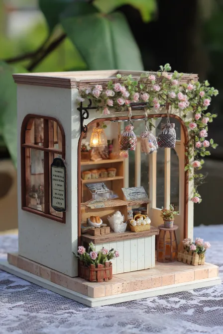 Midjourney Bot 更新时间:2026-01-02 00:20微缩场景,1:24比例双层治愈系面包房,建筑周边是铺满浅米色碎石的小庭院,角落摆迷你铁艺花架,爬满淡粉色蔷薇,旁边立复古木质小招牌,印着手写体面包店名字;面包房墙体是温柔奶白色肌理感墙面,搭配浅原木色包边,一层外墙挂着复古铁艺挂钩,挂着3个迷你帆布烘焙袋;一层门窗是复古格纹推拉玻璃窗,带原木色窗框,玻璃上凝着细碎水汽,贴着手绘小面包贴纸,二层是两扇拱形小窗,挂着米白色亚麻半帘,帘边绣浅棕色麦穗图案;内部一层是操作区+堂食区,操作区有原木色迷你操作台、银色小烤箱、陶瓷发酵盆,台面上摆着黄油块、面粉袋、迷你擀面杖,玻璃展示柜里整齐码着牛角包、可颂、全麦吐司、蔓越莓欧包、碱水结、流心芝士包,色泽金黄油亮;堂食区放2组原木色迷你小桌椅,搭配米色棉麻小坐垫,角落立迷你落地灯,旁边摆一个矮木架,放着复古搪瓷杯和迷你绿植;二层是储物+休闲小阁楼,放着原木储物架,摆着密封玻璃罐(装着谷物、咖啡豆),角落放1个懒人小沙发,铺浅灰色针织毯;灯光是暖黄色柔光,主要光源来自一层操作台上方的复古吊灯、窗边壁灯,二层阁楼的星星串灯,光线柔和不刺眼,照亮面包的细腻纹理,整体画面通透干净,细节拉满,治愈氛围感拉满,8K高清,景深效果,细节极致刻画。 --ar 2:3 --v 7 --c 11 --stylize 100