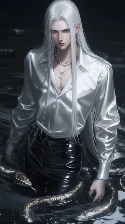 Midjourney Bot 更新时间:2026-01-02 00:26动漫,清晰,复杂细节,最好的质量,超精细,高细节 pixiv插画,画面8K清晰,暗色调,冷色调,天野喜孝风格,一位长发 身穿俊美动漫鲛人男人,站着水里,蛇缠绕。赛璐璐风格,白色长直发,长发柔 顺,冷白皮,珍珠缎面衬衫oversized,,日韩漫画风格,贵族气质, --ar 9:16 --style raw --stylize 180 --niji 6 --no no