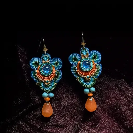 Midjourney Bot 更新时间:2026-01-02 00:26https://images.gogpt.vip/aigf/m_origin/20260102/2010651/lsp37zfplr1df9j9.jpg 精美的手工耳环,采用蓝色和绿色线材精心编织而成,中央镶嵌着一颗闪耀的蓝色宝石,周围点缀着橙色和小珠子。耳环底部悬挂着一颗橙色的水滴状珠子,增添了优雅感。整体设计展现出独特的民族风格和丰富的色彩对比,背景为深色,使耳环的细节更加突出,充满艺术气息。 --ar 1:1 --v 7 --stylize 100 --iw 1.75