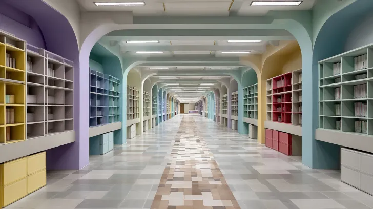 Midjourney Bot 更新时间:2026-01-01 00:25图书馆,复古未来风格,波普美学。模仿电影大师库布里克,模仿电影《芭比》空间和布局,模仿建筑大师高迪。门,白色,蓝色,紫色,薄荷绿色,淡黄色,淡红色,灰色。休息区,圆格子,书架。横向长条形空间,平面场景,细节扩展 --ar 16:9 --v 7 --style raw --stylize 100