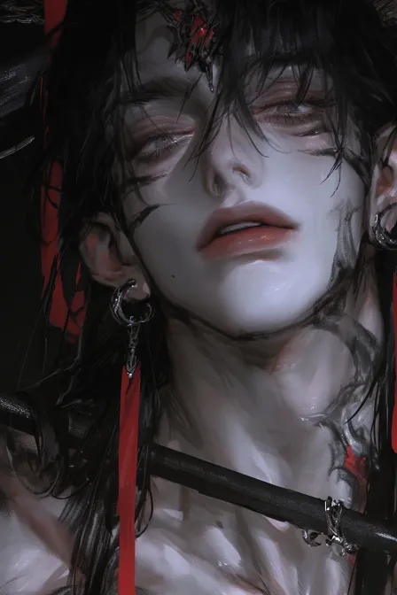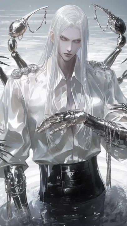 Midjourney Bot 更新时间:2026-01-01 00:26动漫,清晰,复杂细节,最好的质量,超精细,高细节 pixiv插画,画面8K清晰,暗色调,冷色调,天野喜孝风格。一个俊美动漫男人,蜘蛛亮片肩膀 链,胳膊带有钻石蝎子,tassel胸 链,冷白皮,一位长发 身穿俊美动漫鲛人男人,站着水里。赛璐璐风格,白色长直发,长发柔 顺,冷白皮,珍珠缎面衬衫oversized,多足(蝎子),蝎子拟人,日韩漫画风格,贵族气质,白天 --ar 9:16 --style raw --stylize 180 --niji 6 --no no