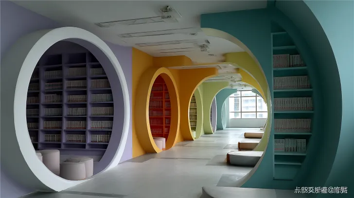 Midjourney Bot 更新时间:2026-01-01 00:26图书馆,复古未来风格,波普美学。模仿电影大师库布里克,模仿电影《芭比》空间和布局,模仿建筑大师高迪。门,白色,蓝色,紫色,薄荷绿色,淡黄色,淡红色,灰色。休息区,圆形门洞,书架。中式元素。横向长条形空间,平面场景,细节扩展 --ar 16:9 --v 7 --style raw --stylize 100