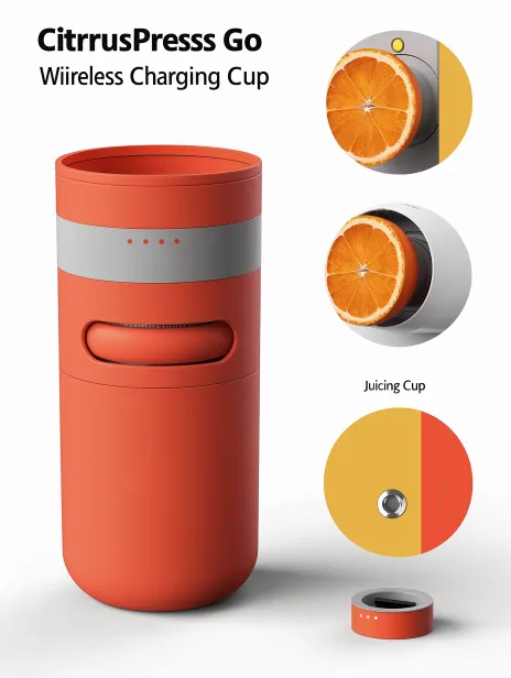 Midjourney Bot 更新时间:2026-01-01 00:27你是资深工业设计师,请为“CitrusPress Go无线充电榨汁杯”完成以下设计: 1. 外观设计:现代简约风格,提供3款配色方案(含材质建议) 你是机电工程师,请解决以下技术问题: 1. 电缸选型:计算挤压橙子所需的最小压力,推荐具体电缸型号 2. 电池管理:设计充放电电路,确保安全且续航达标 3. 防水设计:在活动部件(电缸轴)处实现IPX4防水方案 4. 散热方案:防止电机连续工作过热 5. 输出:提供系统框图、关键部件清单和测试标准 2. 人机交互:设计直观的操作界面和状态指示灯 3. 结构优化:确保单手可操作,重心稳定不倒 4. 尺寸规划:总高度不超过22cm,直径不超过10cm 5. 输出:提供关键部位剖面图描述和CMF(颜色/材料/工艺)表 --ar 3:4 --v 6.0 --stylize 100 --no 不