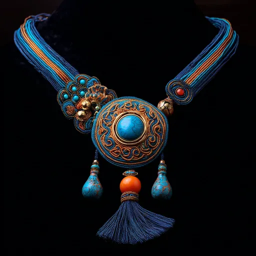 Midjourney Bot 更新时间:2026-01-02 00:01https://images.gogpt.vip/aigf/m_origin/20260102/2010651/z9lakrxlasszbtyw.jpg 精美的手工项链,采用蓝色和金色的线材编织而成,中央挂坠是一颗大而华丽的蓝色宝石,周围环绕着精致的图案和小珠子。项链的两侧有细长的编织线,末端各挂着一颗橙色的珠子,增加了整体的色彩对比。整体设计融合了民族风格,展现出独特的艺术感,背景为深色,使项链的细节更加突出。 --ar 1:1 --v 7 --stylize 100 --iw 0.25