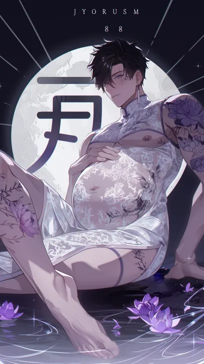 Midjourney Bot 更新时间:2026-01-02 00:04一个俊美动漫男人,怀孕,清晰8K,冷白皮,腹肌可见,双腿细长,发光,夜晚,身上胸前和腿上都有纹身,白色蕾丝旗袍,玉兰薰衣草线画,后仰,呈大字型坐在地上,,正面视角 --ar 9:16 --style raw --stylize 180 --niji 6 --no no