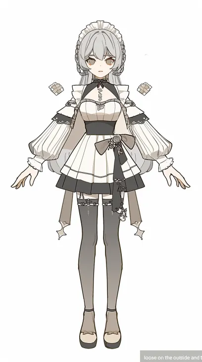 Midjourney Bot 更新时间:2026-01-02 00:08https://images.gogpt.vip/aigf/m_origin/20260101/1686785/8gy82t3422vt8v9t.png 这个人物的服装设计融合了经典女仆装基底与现代二次元拼接设计,整体采用低饱和度的白、灰、浅棕(卡其)为主色调,搭配黑色做细节点缀,风格精致又兼具轻盈的二次元美感,各部分服设细节如下: 1. 头部配饰与发型呼应 头顶佩戴白色荷叶边女仆发箍,是女仆装的经典元素;浅银灰色的头发搭配齐刘海,两侧用浅棕色蝴蝶结做装饰,长发垂坠的线条与手臂处的袖型形成视觉呼应,柔化了整体轮廓。 2. 上装:拼接与层次设计 - 领口为黑色高立领,领口中央缀有浅棕色的装饰带/领结,增加颈部细节; - 胸口区域是白黑拼接,白色为主的衣身搭配黑色肩部/胸口侧片,胸口有镂空设计,辅以金属质感的装饰扣,打破女仆装的单调; - 肩部是大尺寸白色翻领,边缘用线条勾勒轮廓,与内层黑色泡泡袖形成对比;外层为白色宽松喇叭袖,袖管宽大且末端微张,内层黑色短袖(泡泡袖)在肩部衔接,连接处用浅棕色绑带/饰件固定,形成“外松内紧”的袖型层次。 3. 腰部:收腰与装饰结合 腰部系白色细腰带,搭配浅棕色的装饰件与两侧的不规则饰片(浅棕+白色),既起到收腰作用,又通过色彩和造型丰富了腰际视觉,同时衔接上下装的风格过渡。 4. 下装:百褶裙与不对称设计 主体是白色百褶短裙,裙身有细密的褶皱纹理和分层设计;裙摆处叠加浅棕色的不规则下摆/飘片,打破了传统女仆裙的规整感,增添了灵动性,裙边的线条勾勒也强化了造型的精致度。 5. 腿部装饰:细节纹样提质感 穿着深灰色过膝长袜,袜口处印有浅棕色菱形纹样,大腿位置点缀浅棕色细绑带,用简约的几何图案和色彩对比提升腿部设计的细节感,避免大面积灰色的沉闷。 6. 足部:鞋履的风格统一 鞋款为白色为主的尖头短靴/单鞋,鞋帮处有白色交叉绑带设计,鞋头和鞋跟部分做黑+浅棕的拼接,与整体配色体系完全呼应,尖头造型也让整体风格更显利落。 要不要我帮你提炼这份服设的核心设计关键词,方便你快速总结或用于创作参考? --ar 9:16 --stylize 100 --iw 2 --niji 6