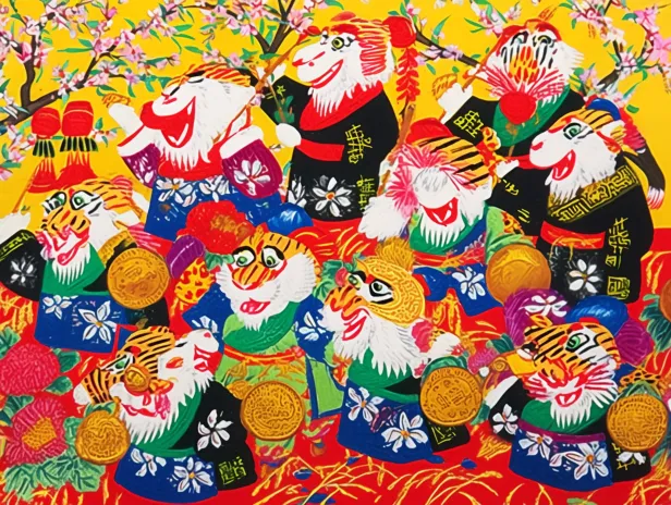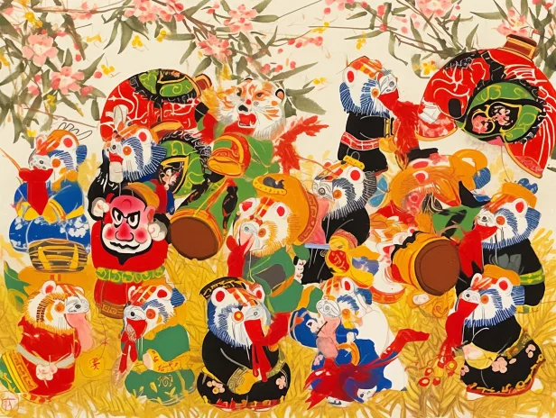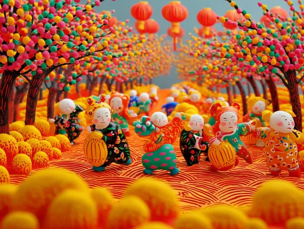 Midjourney Bot 更新时间:2025-12-31 00:12https://images.gogpt.vip/aigf/m_origin/20251230/2008763/kdb1rteebig8bbag.jpg 一幅热闹的农民画风格年画,描绘河南浚县泥咕咕泥偶报春景象:圆头圆脑的彩色泥偶们挤满画面,有的敲锣打鼓,有的举着迎春花枝,还有顶着虎头帽的娃娃造型泥咕咕,背景铺满盛放的桃红柳绿和金色麦穗图案,大红灯笼与碎花布纹样点缀其间。采用饱和的明黄、朱红、靛蓝撞色,黑色粗轮廓线勾勒造型,画面充盈着拙朴的喜庆感,传递泥土芬芳的春日欢歌。 --ar 4:3 --v 7 --stylize 100 --iw 0.5 --oref https://images.gogpt.vip/aigf/m_origin/20251230/2008763/0ovdmuljr9qau8u2.jpeg --ow 477 --no 写实
