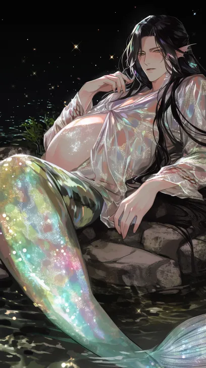 Midjourney Bot 更新时间:2025-12-31 00:16一个俊美动漫鲛人男人卧倒在水里石头上,怀孕,黑色长发柔顺 ,珍珠缎面蕾丝睡袍,流光溢彩makeup,黑色背景,星空 --ar 9:16 --style raw --stylize 180 --niji 6 --no no