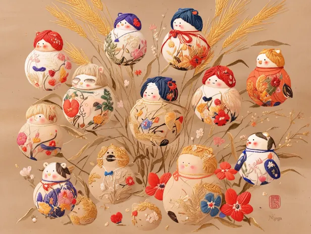 Midjourney Bot 更新时间:2025-12-31 00:19一幅精致的刺绣风格年画,展现河南浚县泥咕咕报春图景:彩线绣制的泥咕咕泥偶群像错落分布,怀抱迎春花的圆胖泥偶、吹泥哨的鸟形泥偶和戴虎头帽的娃娃泥偶以锁链绣针法勾勒轮廓。底布铺满十字绣桃花枝与柳叶纹样,金线绣制的麦穗环绕其间,缎面光泽的朱红、宝蓝、杏黄丝线呈现华丽的渐变效果。苏绣技法的丝理光泽凸显立体感,细密齐针绣出泥土肌理,堆绣工艺塑造鼓胀的泥偶造型,整体构图饱满如传统刺绣屏风,洋溢手工温度与春之喜悦。 脸谱::2,中国结,刺绣,朴素的艺术::4, --ar 4:3 --stylize 100 --niji 6 --no 写实