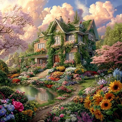 Midjourney Bot 更新时间:2025-12-31 00:19https://images.gogpt.vip/aigf/m_origin/20251230/1987538/44w7vx89hq0litcw.png 梦幻般的花园别墅,房屋外墙覆盖着绿藤,窗台上装饰着鲜花,整体呈现出自然与建筑的完美融合。周围是五彩缤纷的花朵,包含向日葵、玫瑰和其他各种花卉,形成了一片生机盎然的花海。前面有一条蜿蜒的小路和一个宁静的池塘,水面反射出周围的景色,增添了画面的和谐美感。天空中有柔和的云朵,整体氛围温馨而宁静,展现出理想的田园生活。 --ar 1:1 --v 7 --stylize 100 --iw 1.75