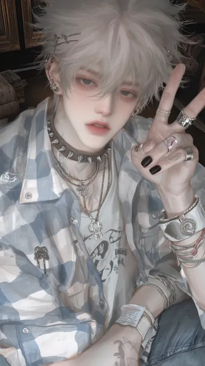 Midjourney Bot 更新时间:2026-01-01 00:02少年感,眼神无辜,金色头发,黑色眼睛,浅蓝白色格子衬衫,铆钉项圈,发卡装饰,耳钉,一只手对着镜头比剪刀手,牛仔裤,手腕戴着朋克装饰,脖子上有许多项链。黑色指甲。细腻厚涂,帅哥,朋克,房间,背景丰富,俯视视角,半身像,远景广角[object Object] --ar 9:16 --style raw --stylize 800 --niji 6 --sref https://images.gogpt.vip/aigf/origin/20251230/1767110218232668_3.png https://images.gogpt.vip/aigf/origin/20251229/1766986013538251_2.png --sw 191 --profile m212hx7 --no 女生,女性,娃娃脸,鼻钉,长发,妖艳,挑染,美丽,阴暗,鼻钉,仰头,水,眼泪,汗水