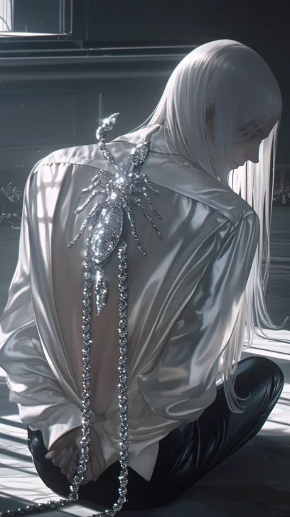 Midjourney Bot 更新时间:2026-01-01 00:03动漫,清晰,复杂细节,最好的质量,超精细,高细节 pixiv插画,画面8K清晰,暗色调,冷色调,天野喜孝风格。一个俊美动漫男人,蜘蛛亮片背链,脊椎骨带有钻石蝎子,tassel背链,冷白皮,跪着地板上,跪着地上。赛璐璐风格,白色长直发,长发柔 顺,冷白皮,珍珠缎面衬衫oversized,多足(蝎子),蝎子拟人,背对着镜头,日韩漫画风格,贵族气质,白天 --ar 9:16 --style raw --stylize 180 --niji 6 --no no