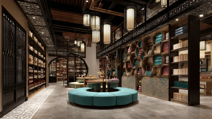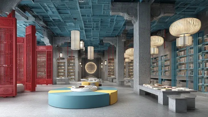 Midjourney Bot 更新时间:2026-01-01 00:04图书馆,复古未来风格,波普美学。模仿电影大师库布里克,模仿电影《空山灵雨》空间和布局,模仿建筑大师高迪。中式元素,中式道观氛围。门,白色,蓝色,灰色。休息区,圆格子,模块化书架,中式吊灯和灯膜。横向长条形空间,平面场景,细节扩展 --ar 16:9 --v 7 --style raw --stylize 100