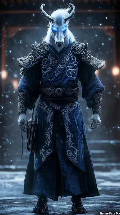 Midjourney Bot 更新时间:2025-12-30 00:05黑色神话:恶魔的气息弥漫,电影级中景镜头,特写镜头正面平视,中国地府判官“马面”。他是一个高大健硕的**人形生物**,长着一颗很大的庄严、帅气的白色骏马头颅,双眼散发着冷静的蓝光。他拥有**完全的人类躯干和四肢**,笔直站立,身穿一件华丽而厚重的深蓝与黑色古风判官长袍,袍身绣有银色云雷纹。一道强烈的正面主光打亮他的全身,侧后方有微弱的轮廓光将其从幽暗的阎罗殿背景中分离出来。对称式构图,角色双手自然垂于身前或持握卷宗,**姿态沉稳如岳**。摄影风格融合古典肖像画的庄重与《沙丘》电影的史诗质感,强调其作为人形神祇的威严与压迫感,超写实细节,古风玄幻风格,画面主要使用天青色和深红色风格,可怕的民间传说,全景拍摄,反应拍摄,风,色彩鲜艳,生动,高质量,超高,动态,(8k,原始照片),清晰的焦点,(疯狂的细节),高细节的照片,摄影现实主义,超现实主义,连续的角度,完美的构图,自然的几何形状,相机看着过去,闪闪发光的眼睛,昏昏欲睡的脸,模拟电影照片,薄雾和灰尘--第6.1节—第9:16节 --ar 9:16 --v 6.1 --stylize 100