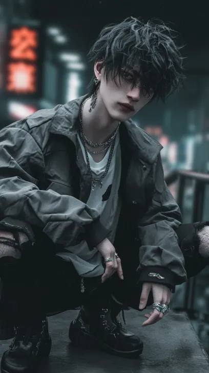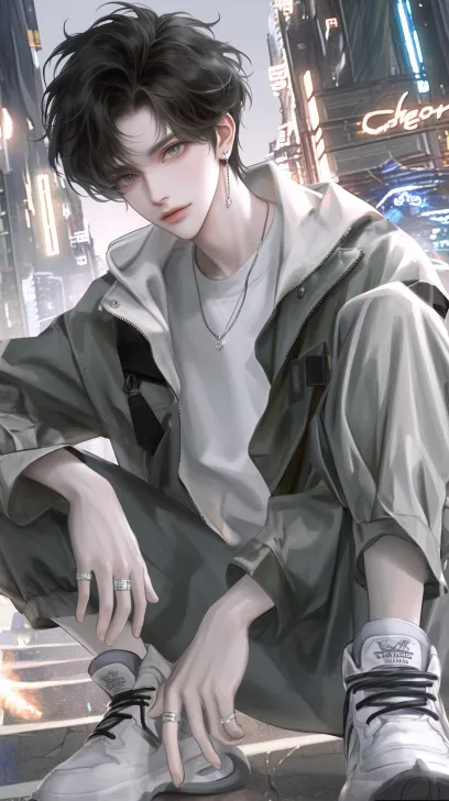 Midjourney Bot 更新时间:2025-12-30 00:06全身照片,英俊年轻男子拥有黑色波浪短发,身穿灰色轻便风衣内搭白色衬衫,配戴钻石耳钉,蹲在石阶上,一只手随意放于膝盖,面带温暖微笑注视镜头。背景为深邃城市夜晚景象,霓虹灯光点缀天际线,电影般光影效果营造戏剧氛围。超高清细节,Octane渲染,Richard Avedon摄影风格,逼真质感突显皮肤纹理和服饰褶皱。动漫风格 --ar 9:16 --stylize 100 --niji 6 --profile z71sy35
