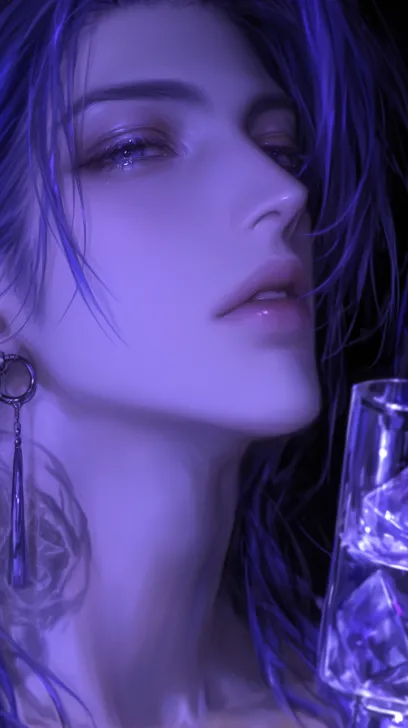 Midjourney Bot 更新时间:2025-12-30 00:06正视镜头,全身肖像,远景,远距离,熟男,成男,男性,深蓝色长发,银灰色眼睛,神色忧郁,纯黑色背景,右下角有一瓶蓝色香水,左下角有一杯酒杯,酒杯里面有冰块,赛博朋克风,极致阴影明暗对比 --ar 9:16 --stylize 1000 --niji 6 --profile sfput8h