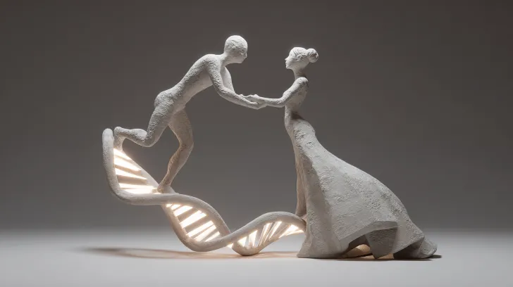 Midjourney Bot 更新时间:2025-12-30 00:08一张3D数字雕塑的雕塑整体图 雕塑主题:伏羲与女娲的人首蛇身相互缠绕,形成DNA双螺旋结构。女娲手持发光的泥人,女娲整体线条圆润圣母的形象,伏羲线条刚劲,非对称构图。减少赛博科技感,形体正确,二人材质白色大理石,背景空白女娲站立弯腰伏羲坐着 --ar 16:9 --v 7 --style raw --stylize 100 --no symmetry,bright colors,gloss,special effects,scales