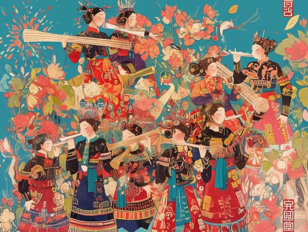 Midjourney Bot 更新时间:2025-12-30 00:09https://images.gogpt.vip/aigf/m_origin/20251229/2007361/jh24aphrbi5fjqtb.jpg https://images.gogpt.vip/aigf/m_origin/20251229/2007361/dahsuylto2xjd28s.jpg https://images.gogpt.vip/aigf/m_origin/20251229/2007361/dyadsvjinic7xt6b.jpg https://images.gogpt.vip/aigf/m_origin/20251229/2007361/e00gdfwjj2eh2fds.jpg https://images.gogpt.vip/aigf/m_origin/20251229/2007361/gt916asfmyrsl1fp.jpg 农民画领略不同地域风情侗族农民画,传统民俗绘画艺术,农村生活,能感受到劳动人民的感情和美好愿望。画面以侗族芦笙踩堂舞为核心题材,描绘了侗族群众身着特色盛装、吹奏芦笙起舞的热闹节庆场景。融合了侗族传统彩绘、刺绣与剪纸的艺术特点,采用浓烈的色彩对比(大红背景搭配侗族蓝靛色服饰、黄/绿点缀) 剪纸, --ar 4:3 --stylize 100 --iw 0.5 --niji 6
