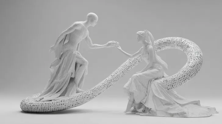 Midjourney Bot 更新时间:2025-12-30 00:09一张3D数字雕塑的雕塑整体图 雕塑主题:伏羲与女娲的人首蛇身相互缠绕,形成DNA双螺旋结构。女娲手持发光的泥人,女娲整体线条圆润圣母的形象,伏羲线条刚劲,伏羲手持由流动二进制代码构成的数字卦象。非对称构图。减少赛博科技感,形体正确,二人材质白色大理石,背景空白女娲站立弯腰伏羲坐着 --ar 16:9 --v 7 --style raw --stylize 100 --no symmetry,bright colors,gloss,special effects,scales
