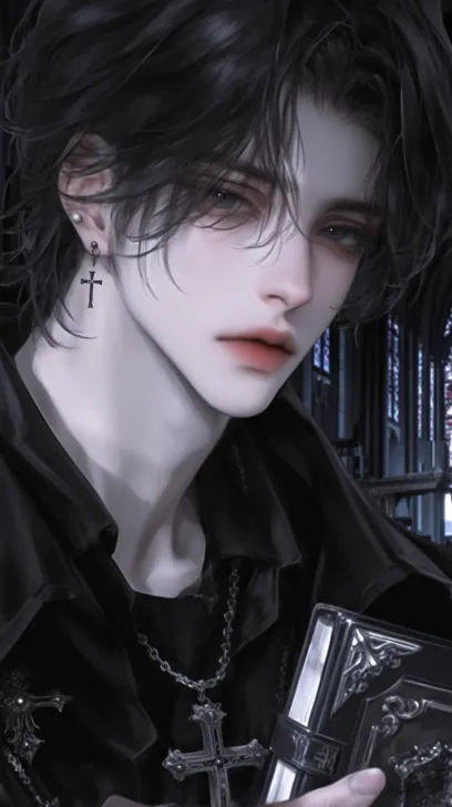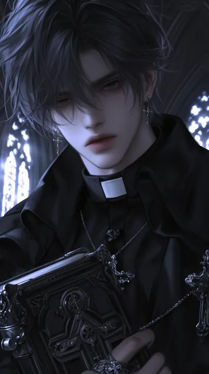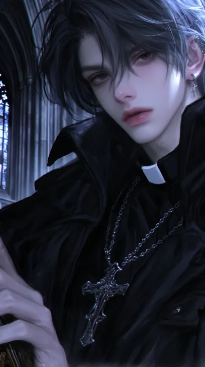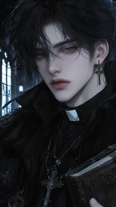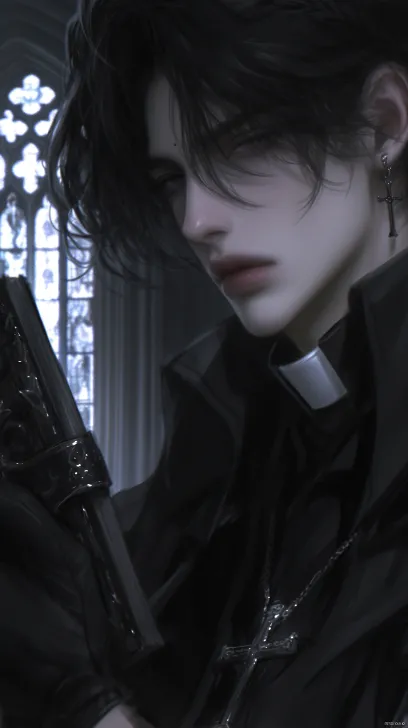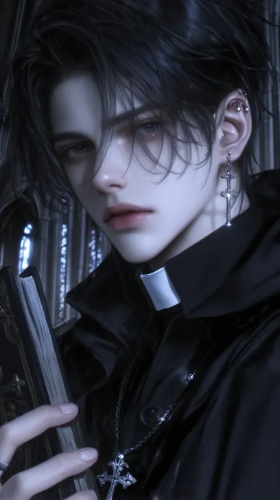 Midjourney Bot 更新时间:2025-12-29 00:08一个帅气的男性,成年男性,黑色短发蓬松凌乱,黑色的眼睛冷漠着,看着镜头,身穿黑色的神父服装,西幻风格,黑色披肩和十字架项链,手里拿着一本复古书,背景是暗色调的教堂,背光,8k超高清画质,冷色调 --ar 9:16 --stylize 1000 --niji 6 --profile mtigg2v m55amsz zcybdkq hxc2xte k3enpop --no 仰头,腿,真人感,写实,成熟,胡子,老人,短发,张嘴,厚嘴唇,怼脸拍