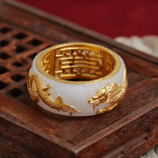 Midjourney Bot 更新时间:2025-12-29 00:09设计一个黄金戒指,要有中国同心结元素,中间一个镂空的中国同心结,左边白玉雕成的简约龙,右边白玉雕成的简约凤 --ar 1:1 --v 7 --stylize 100