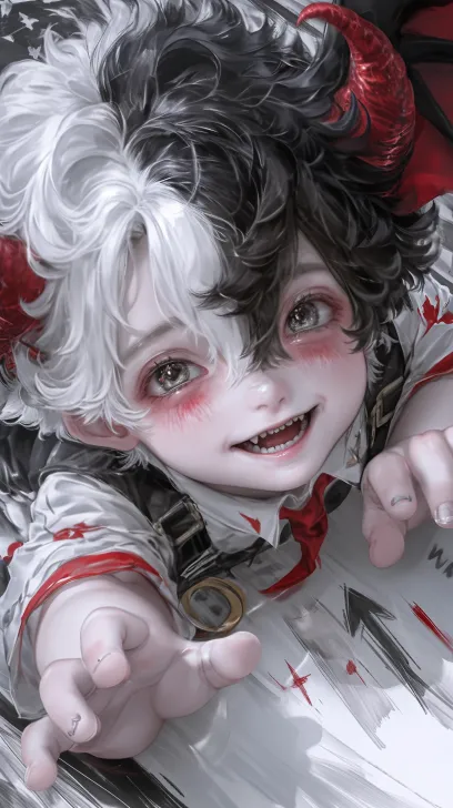 Midjourney Bot 更新时间:2025-12-28 00:10一个年轻的帅哥,第一视角,极端视角黑白拼色短发(左侧头发白,右侧头发黑),红色恶魔角,白色T恤,可爱的表情,微笑,痴迷的笑,俯视视角,压迫感,互动感。画面有笔触感,高清,超清分辨率,8K,细节 --ar 9:16 --style raw --stylize 231 --niji 6 --profile 138q21m zksgyr4 uh7zf4j --no 胡子,耳钉,黑色遮挡物,水渍,真人感