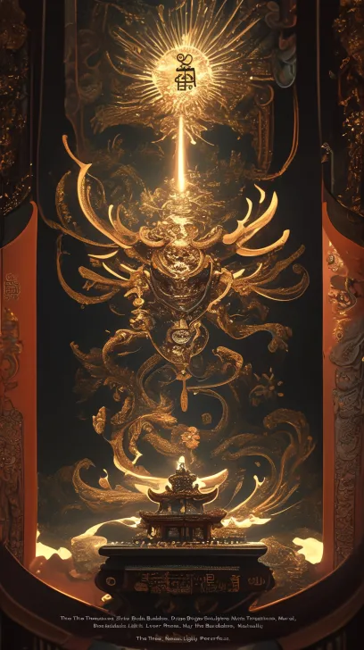 Midjourney Bot 更新时间:2025-12-28 00:10博物馆殿堂级艺术海报,展现大召寺“三绝”文物。构图:顶部是黑暗穹顶中射下一束神圣光线,光线中隐约有飘动的金色梵文种子字。光束正下方,三件国宝级文物在深色背景上并置陈列:正中央是“银佛”头部特写,面容慈悲,泛着柔和银光;左侧是“龙雕”金柱的局部,金龙盘绕,鳞片璀璨;右侧是“壁画”残片特写,绘有护法神像,色彩斑驳古雅。三件文物下方,是一个厚重的深红色石质基座。基座正面,是深刻清晰的阴刻铭文,汉字为“佛光永驻,三绝天成”,字体为庄严的北魏楷书,填以金色。 整体光线如博物馆重点照明,突出文物质感,氛围静谧神圣。色调以深黑、暗红、鎏金、银白为主。 --ar 9:16 --stylize 100 --niji 6