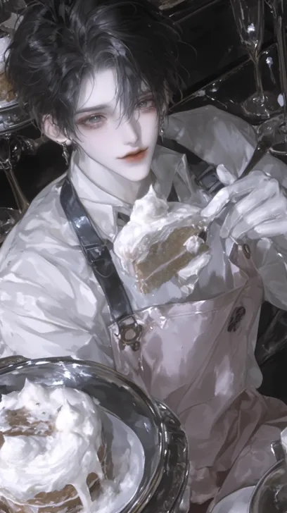 Midjourney Bot 更新时间:2025-12-28 00:13动漫伪厚涂画风,精致的细节。镜头从上向下看。一个帅气的男性,有着一双漂亮的眼睛,黑色头发,穿着粉色围裙,拿着蛋糕,奶油点在鼻尖上,无辜的看着镜头,厚涂风格,bjd感 --ar 9:16 --style raw --seed 1002239445 --stylize 1000 --niji 6 --sref https://images.gogpt.vip/aigf/origin/20251227/1766832346316574_4.png --sw 191 --profile jeown7f --no 仰头,纹身,女生,女性,娃娃脸,鼻钉,长发