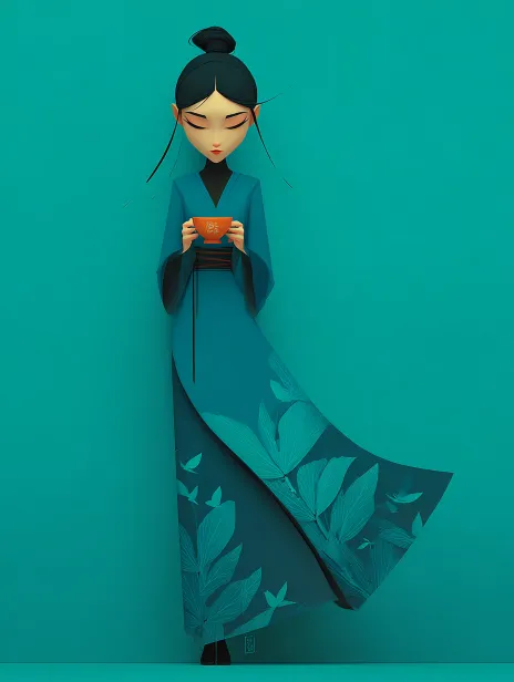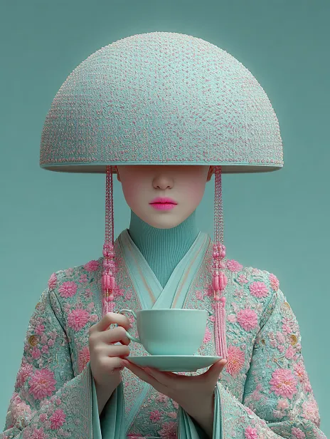 Midjourney Bot 更新时间:2025-12-28 00:15新中式仕女极简 IP 角色设计,仕女优雅喝茶的姿态,极致极简主义,超现实极简主义,中式美学,先锋艺术,极简图形设计,面容全部遮蔽无面部刻画,仅仕女的衣袍与中式配饰空灵悬浮,干净无杂的纯色画面,大胆高饱和度配色,粉白绿发光渐变纯色背景,极简淡蓝纯色干净背景,原研哉的极简留白美学,Malika Favre 的矢量渐变插画风格,平面化图形表达,空灵意境,高级质感。 --ar 3:4 --v 7 --stylize 1000