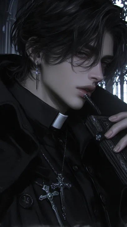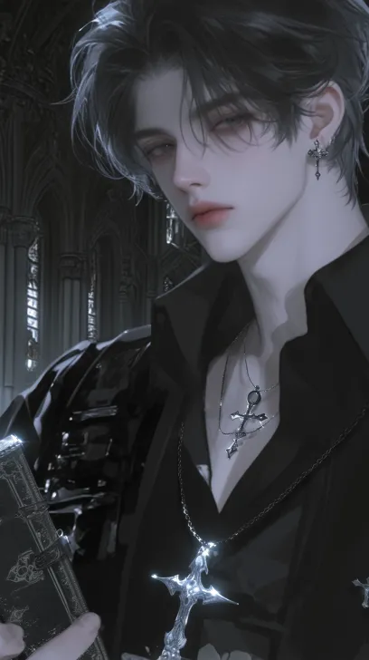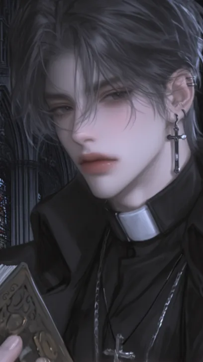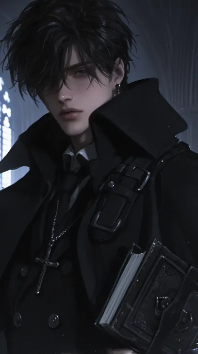 Midjourney Bot 更新时间:2025-12-29 00:04一个帅气的男性,成年男性,黑色短发蓬松凌乱,黑色的眼睛冷漠着,看着镜头,身穿黑色的神父服装,西幻风格,黑色披肩和十字架项链,手里拿着一本复古书,背景是暗色调的教堂,背光,8k超高清画质,冷色调 --ar 9:16 --stylize 1000 --niji 6 --profile m55amsz mtigg2v zx722h4 k3enpop zcybdkq --no 仰头,腿,真人感,写实,成熟,胡子,老人,短发,张嘴,厚嘴唇,怼脸拍
