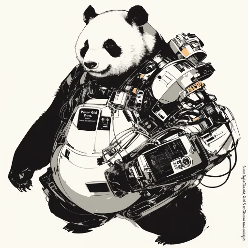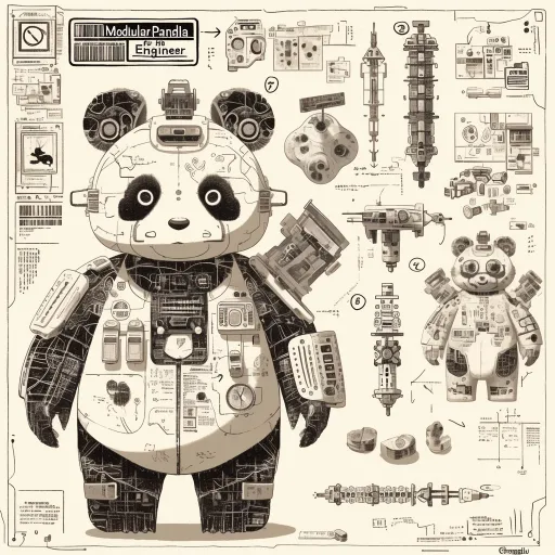 Midjourney Bot 更新时间:2025-12-29 00:03生成一个模块化设计的黑白线稿,主题为“成都电网模块化熊猫工程师”。 形象要求:熊猫形象由多个可识别的功能模块拼接而成:头部模块(含AR护目镜)、躯干模块(印有电路板与竹节融合纹路)、工具臂模块(可替换为钳形表/绝缘杆)、能源背包模块(形似充电宝,表面有成都环城绿道地图)。 风格:扁平化、几何化,但造型圆润可爱。模块连接处用点线示意,整体干净整洁,如同高级玩具或工具设计图。纯线稿,无填色。 --ar 1:1 --stylize 100 --niji 6