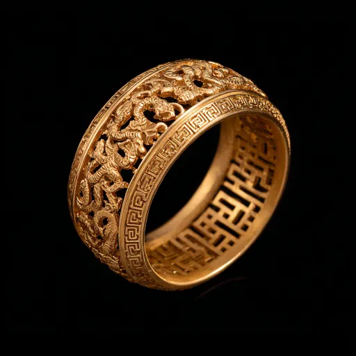 Midjourney Bot 更新时间:2025-12-29 00:04设计一个黄金戒指,要有中国同心结元素,镂空设计, --ar 1:1 --v 7 --stylize 100