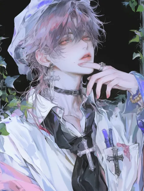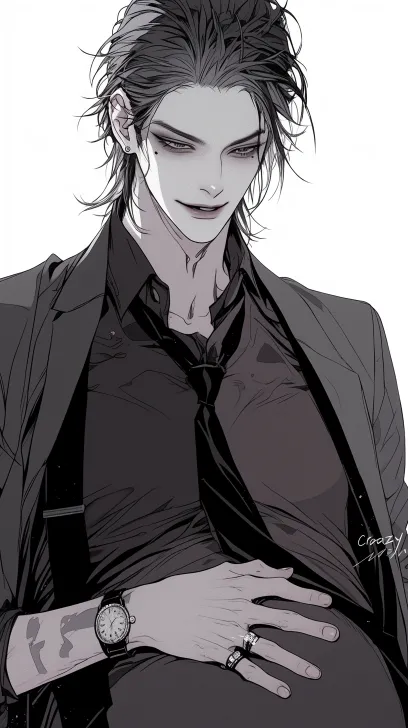 Midjourney Bot 更新时间:2025-12-27 00:19视觉系帅哥,黑白线画,日韩漫画,暖色调,清晰8K。黑 色直发,黑眼睛,冷漠的眼睛,冷白皮,嘴唇浅色,帅哥,痞帅疯批风男性,怀孕,灰色凌乱大背头,冷白皮,冷色调画面。妆容高级暗黑系,厌世眼(双眼皮线条细致),高鼻梁薄唇,邪魅一笑,眼角有一颗很小的黑痣,面部具权威感。画面聚焦面部细节,画质高清细腻,突出暗黑系妆容与五官立体感。身着深色衬衫+黑色马甲+黑色领带,配饰有手表、钻戒。动作具痞帅疯批张力。 正面视角, --ar 9:16 --style raw --stylize 180 --niji 6 --no no