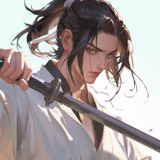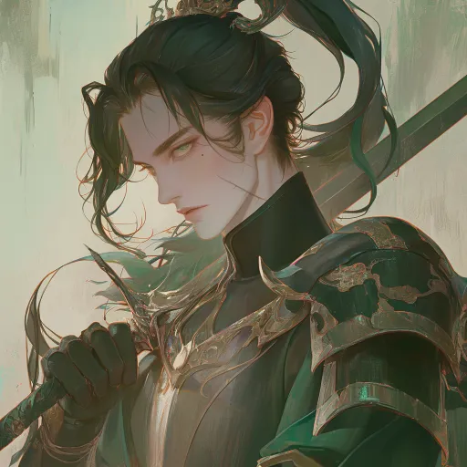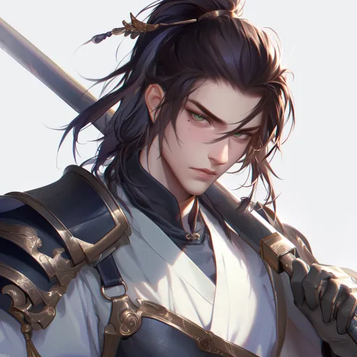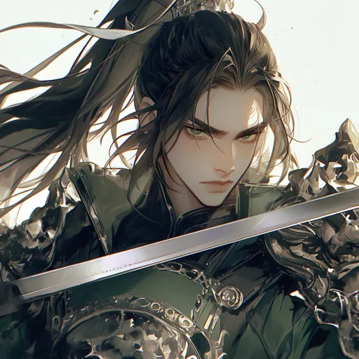 Midjourney Bot 更新时间:2025-12-27 00:23少年,男性,将军,长刀,黑色长发束起成高马尾,绿眸,样貌精致,白肤,但看起来有些憔悴和疲惫。眼角泪痣,富有漫画感,少年感 细腻肤质,最佳质量,16K质量,干净背景, --ar 1:1 --stylize 100 --niji 6