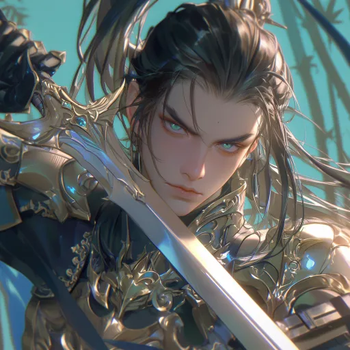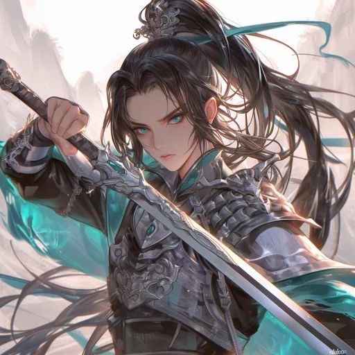 Midjourney Bot 更新时间:2025-12-27 00:25少年,男性,将军,长刀,轻甲,黑色长发束起成高马尾,绿眸,样貌精致,白肤,眼角泪痣,富有漫画感,少年感 细腻肤质,最佳质量,16K质量,干净背景, --ar 1:1 --stylize 100 --niji 6