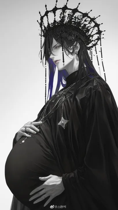 Midjourney Bot 更新时间:2025-12-27 00:22视觉系帅哥,黑白线画,日韩漫画,暖色调,清晰8K。黑色直发,黑眼睛,冷漠的眼睛,冷白皮,嘴唇浅色,俊美男人,怀孕,视觉系帅哥,由贵香织里风格和CLAMP风格,一个穿着黑色斗篷、黑色串珠九旒冕遮住脸的年轻男人,星河俊美男人 ,圆领交领长袍 。身上戴着精致头饰和银首饰 ,蓝紫/黑灰色头发黑白画风,清晰8k,冷白皮,腹肌可见, --ar 9:16 --style raw --stylize 180 --niji 6 --no no