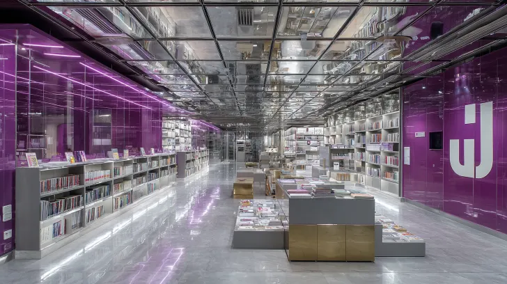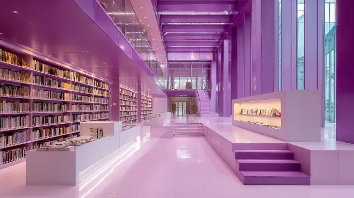 Midjourney Bot 更新时间:2025-12-27 00:26图书馆,超现实主义风格,波普美学。模仿电影大师雅克塔蒂,模仿电影《肌肤》空间和布局,模仿建筑大师高迪。门,紫色色,白色,银色,金色。幻彩不锈钢金属,绒布,亮面,银色圆管。围坐区,阅读区,书架,写字区,藏书区,横向长条形空间,平面场景,细节扩展, --ar 16:9 --v 7 --style raw --stylize 100